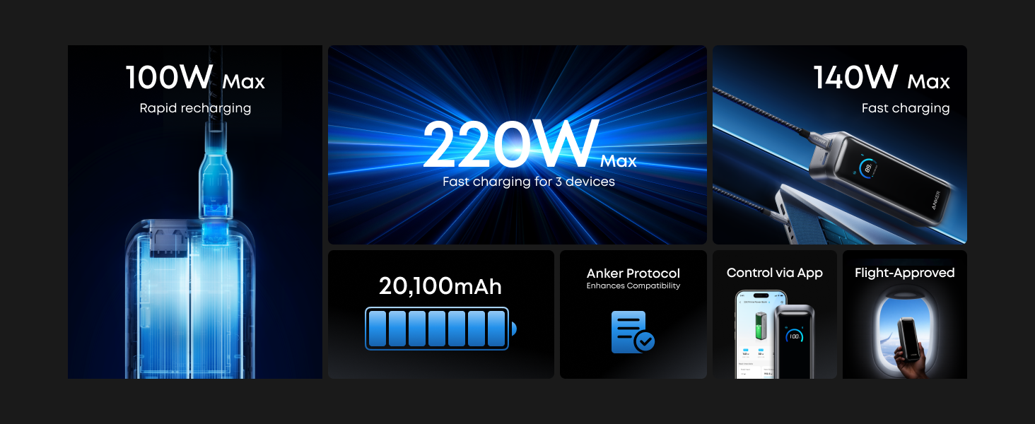 USB-C: 5V⎓3A / 9V⎓3A / 10V⎓2.25A / 12V⎓3A / 15V⎓3A / 20V⎓5A / 28V⎓5A (140W Max) USB-A: 5V⎓3A / 9V⎓2A / 10V⎓2.25A / 12V⎓1.5A (22.5W Max)
