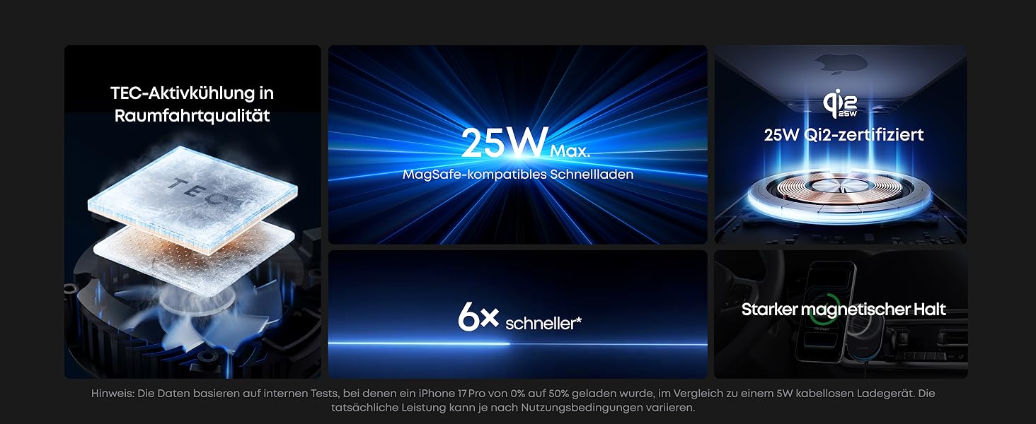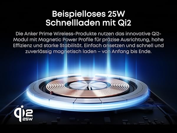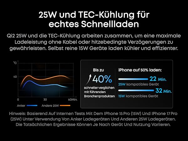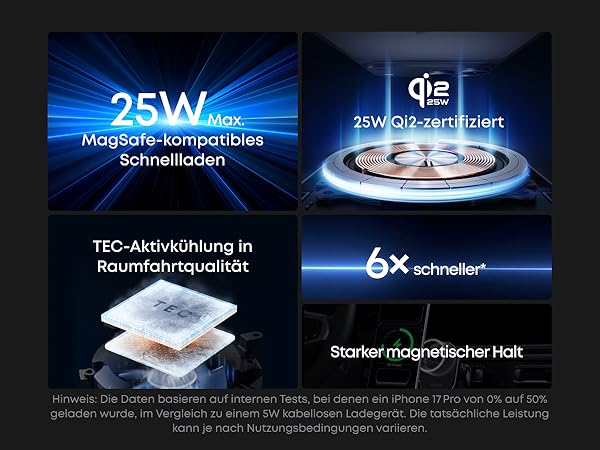 Next-Level-Geschwindigkeit Ausgestattet mit dem neuesten Qi2 25W-Modul liefert das Anker Prime kabellose Kfz-Ladegerät kraftvolles 25W Magnetladen, das dein iPhone 17 Pro in nur 22 Minuten auf 50% bringt.