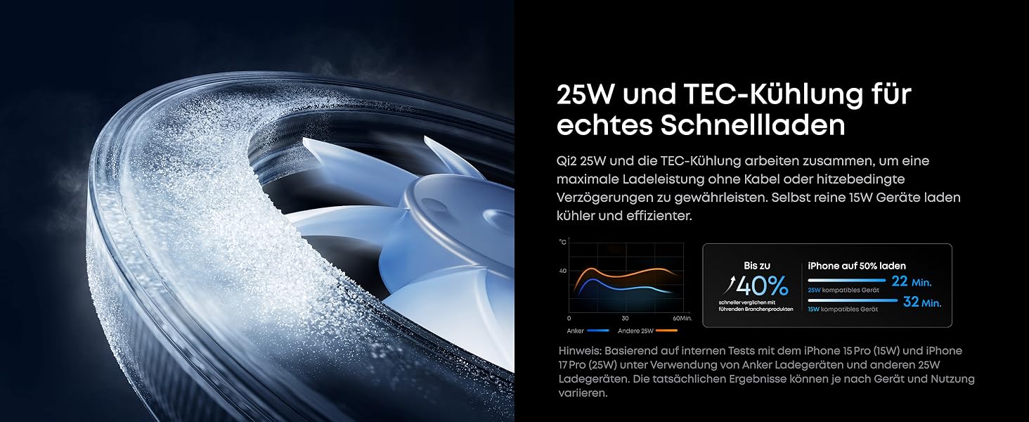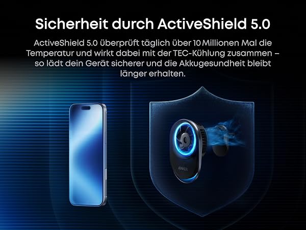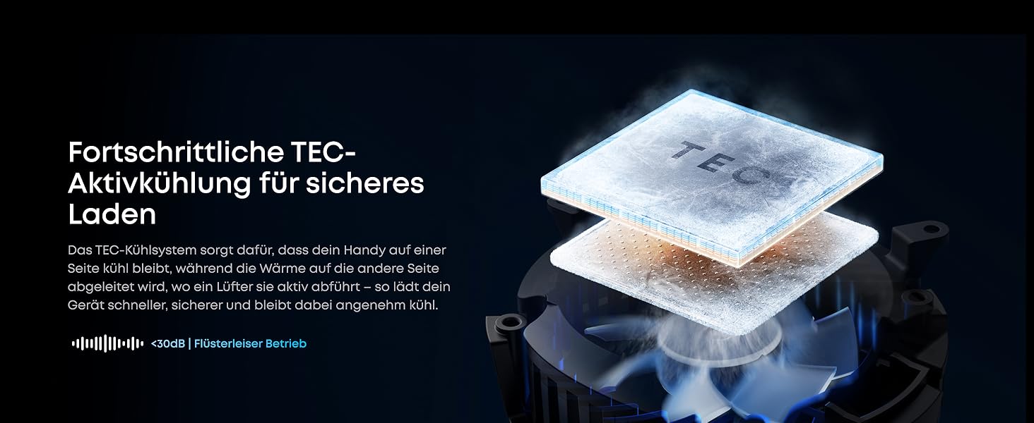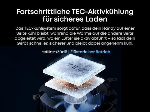 Sichere, aktive Kühlung Schneller laden ohne Hitzeentwicklung. Das thermoelektrische Kühlungssystem (TEC) leitet die Wärme von der Ladefläche zur Rückseite des Moduls, wo ein eingebauter Lüfter sie verteilt – für sicheres und effizientes Laden.