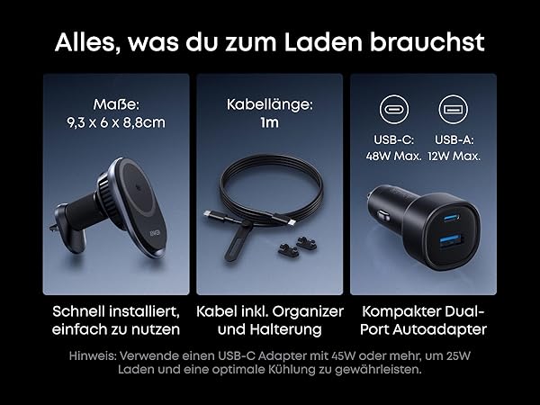 Hinweise Verwende einen USB-C Adapter mit 45W oder mehr, um 25W Laden und eine optimale Kühlung zu gewährleisten.