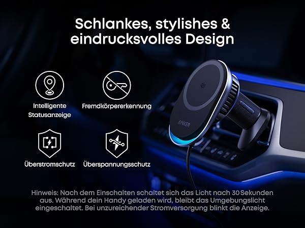 Hinweise Das Umgebungslicht leuchtet beim Einschalten 30 Sekunden lang und bleibt während des Ladevorgangs kontinuierlich eingeschaltet.