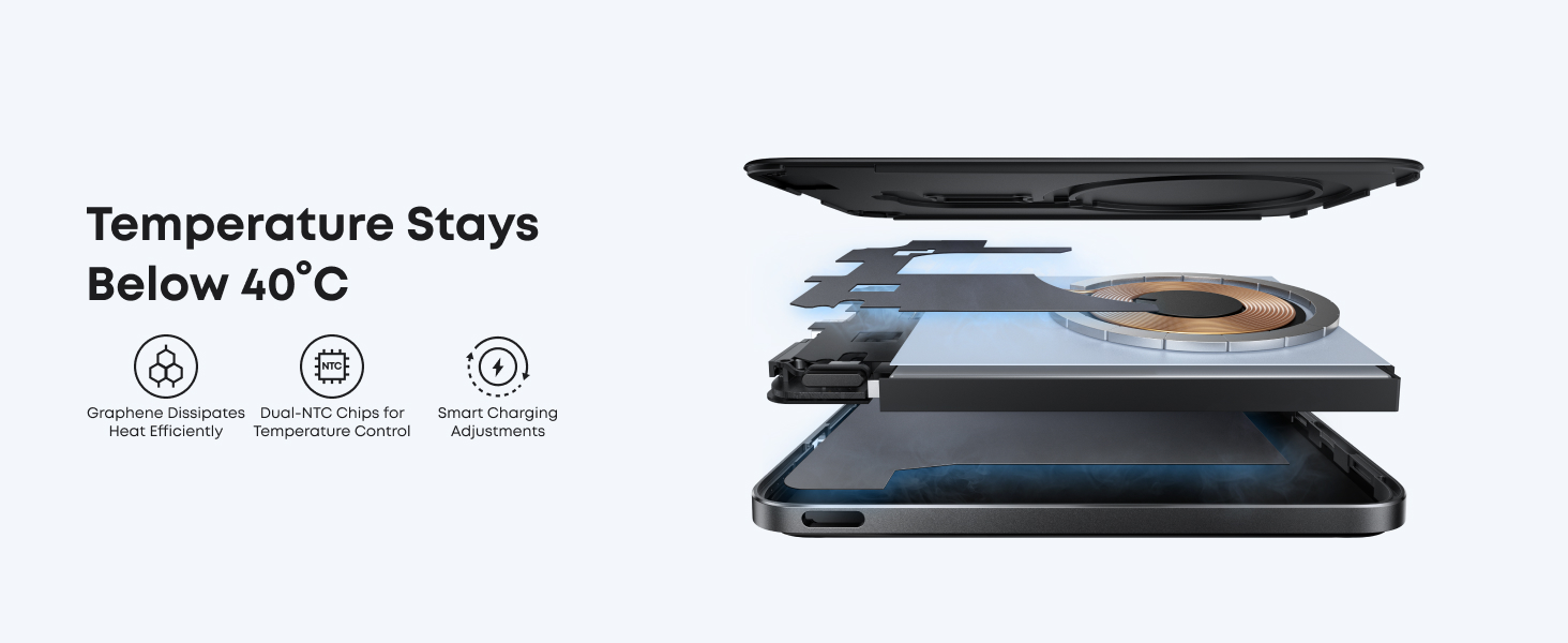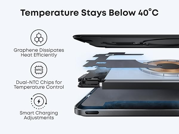 • 104℉ for Safer Handling: With the exceptional cooling benefits of graphene, dual NTC chips, and smart charging adjustments, this power bank stays below 104℉, 14 degrees cooler than the industry standard, for safer and more reliable charging performance.