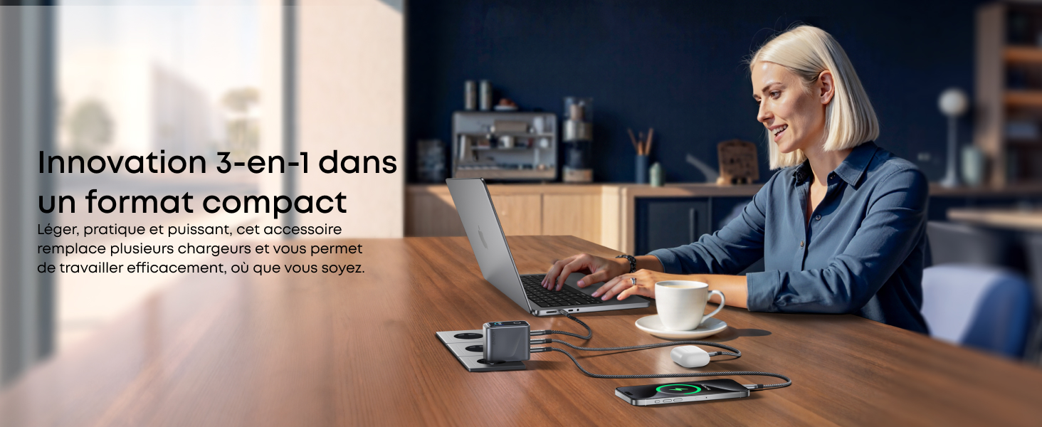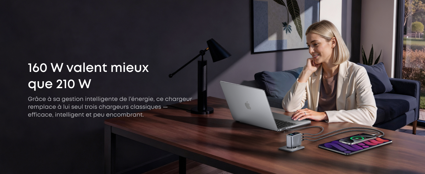 Taille d’un boîtier AirPods, puissance 160 W : Avec sa densité énergétique de 1,35 W/cm², ce chargeur USB-C 3 ports est fin, élégant, et fournit une puissance totale de 160 W. Compact comme un boîtier d’AirPods Pro 3, il vous suit partout sans vous encombrer.