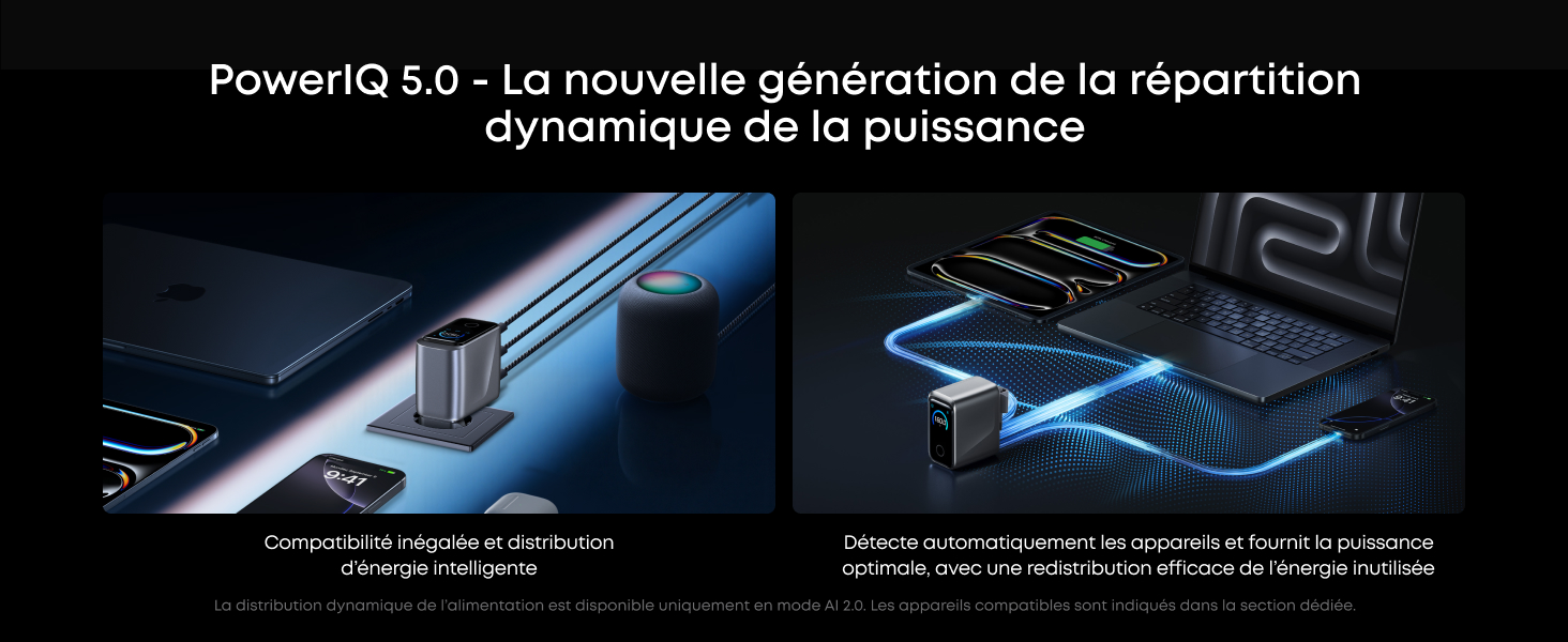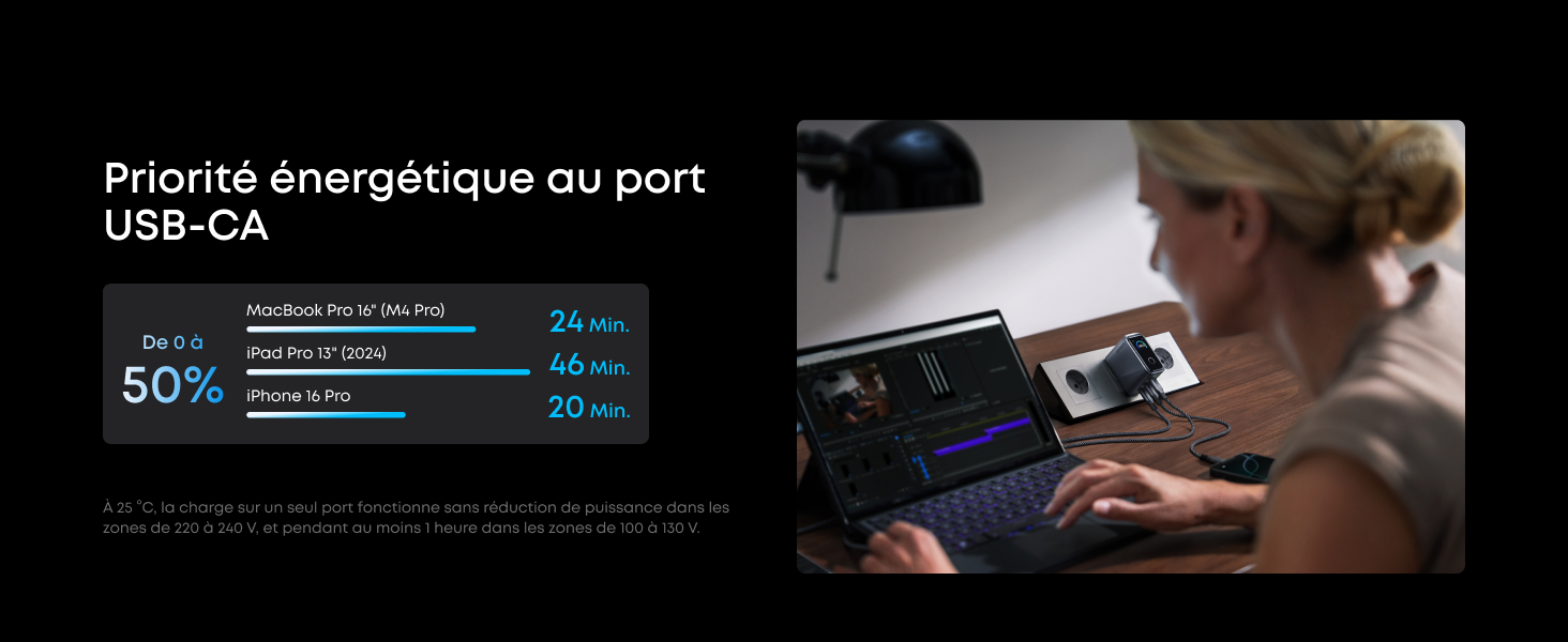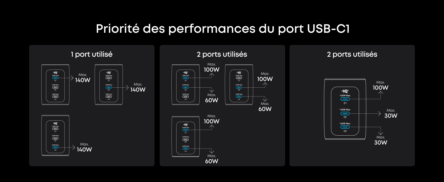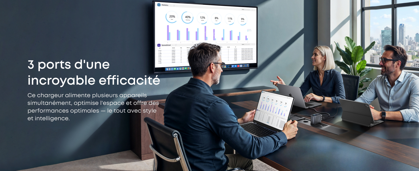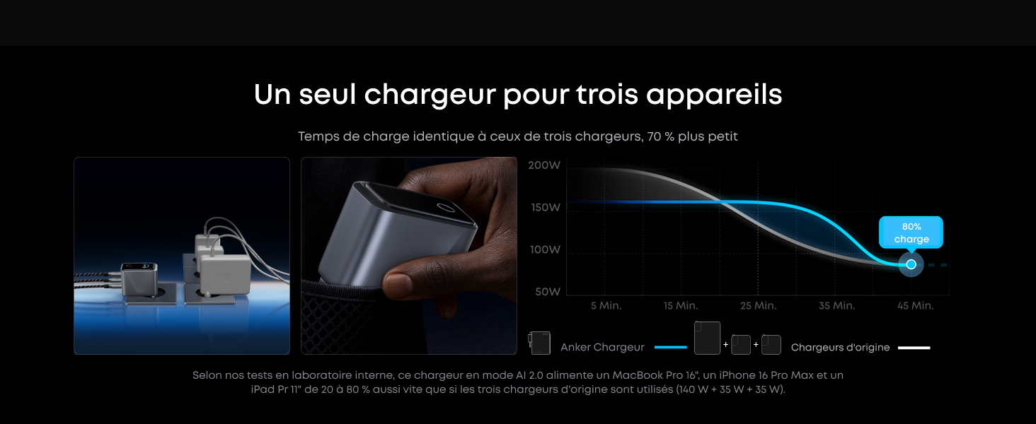 Un chargeur, trois appareils : Grâce à la répartition énergétique intelligente optimisée par PowerIQ 5.0, alimentez simultanément votre MacBook Pro 16", votre iPhone 16 Pro Max et votre iPad Pro 11". Plus besoin de trois chargeurs (140 W + 35 W + 35 W), le nôtre est suffisamment puissant pour alimenter vos appareils en toute situation.