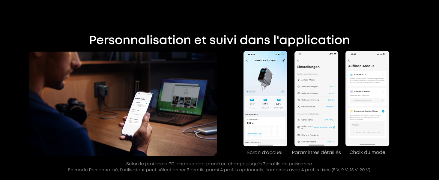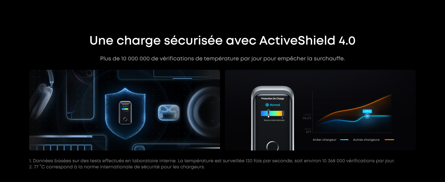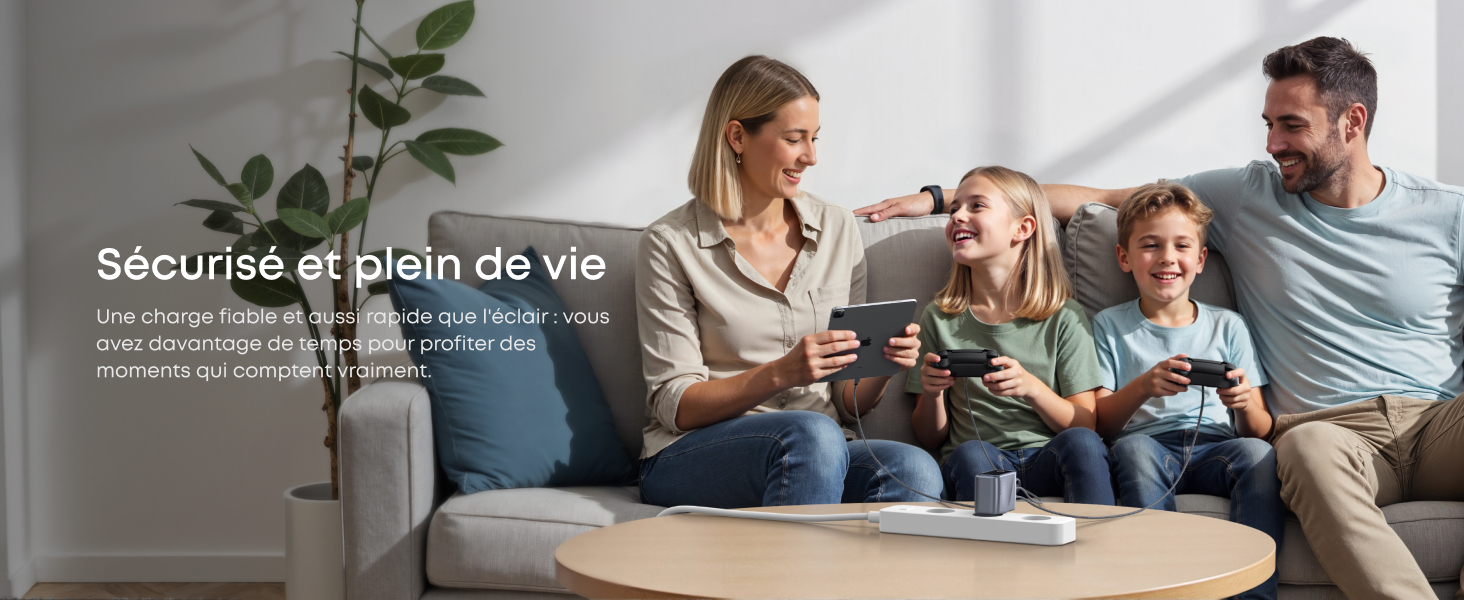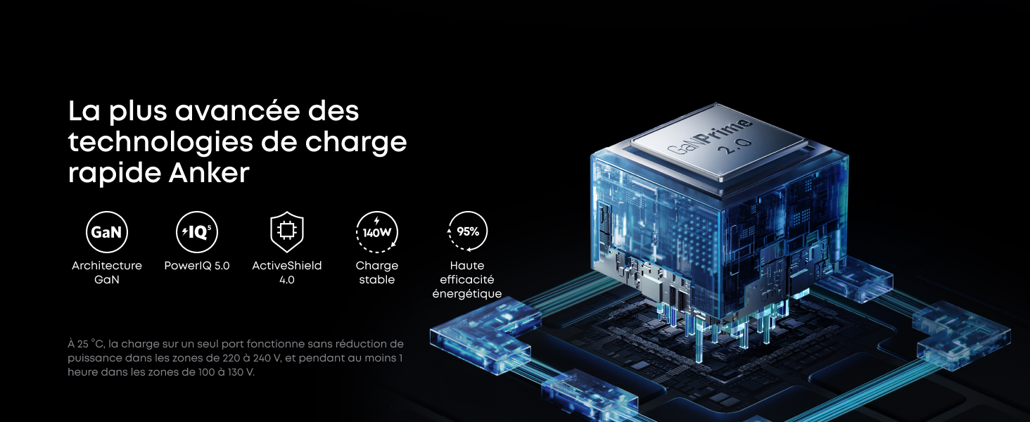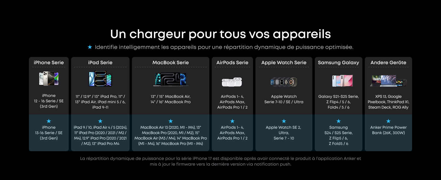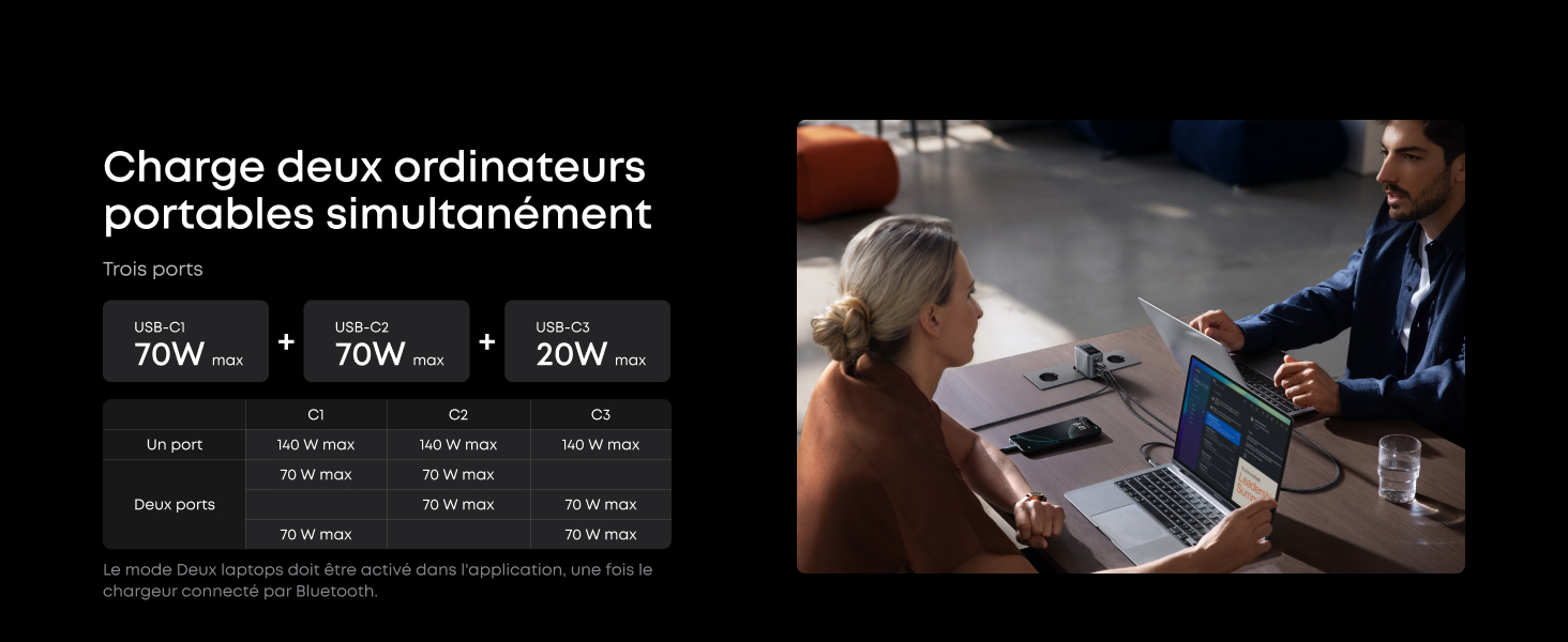 Un chargeur, trois appareils : Grâce à la répartition énergétique intelligente optimisée par PowerIQ 5.0, alimentez simultanément votre MacBook Pro 16", votre iPhone 16 Pro Max et votre iPad Pro 11". Plus besoin de trois chargeurs (140 W + 35 W + 35 W), le nôtre est suffisamment puissant pour alimenter vos appareils en toute situation.