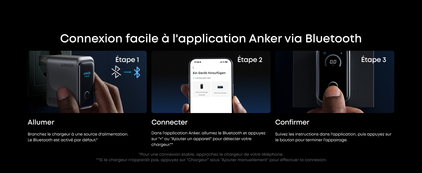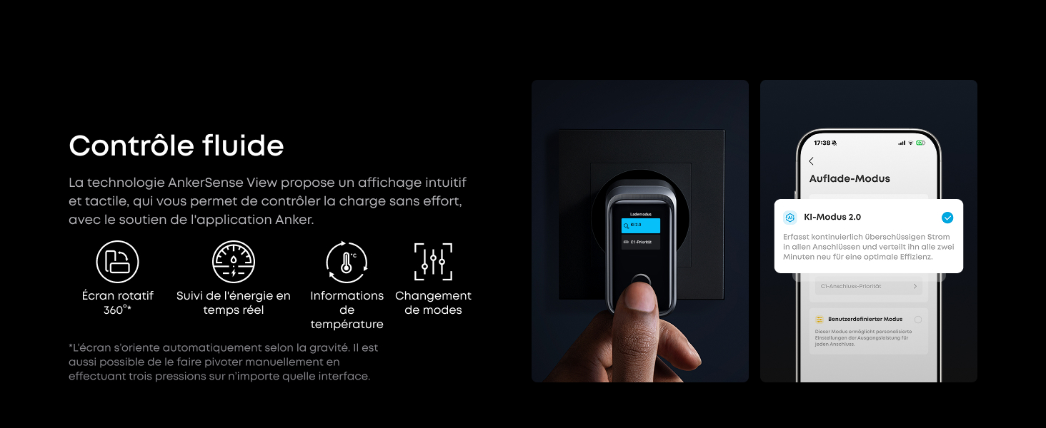 Contrôle intelligent de la charge : Grâce à la technologie AnkerSense View, suivez en temps réel vos paramètres énergétiques, qui s’affichent sur l’écran intelligent. Connectez-vous via Bluetooth pour changer de mode instantanément et personnaliser vos préférences dans l’application.