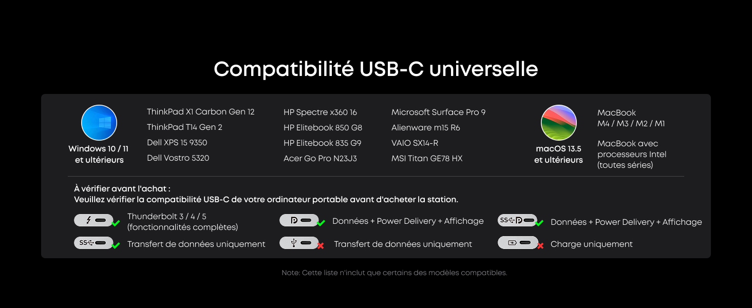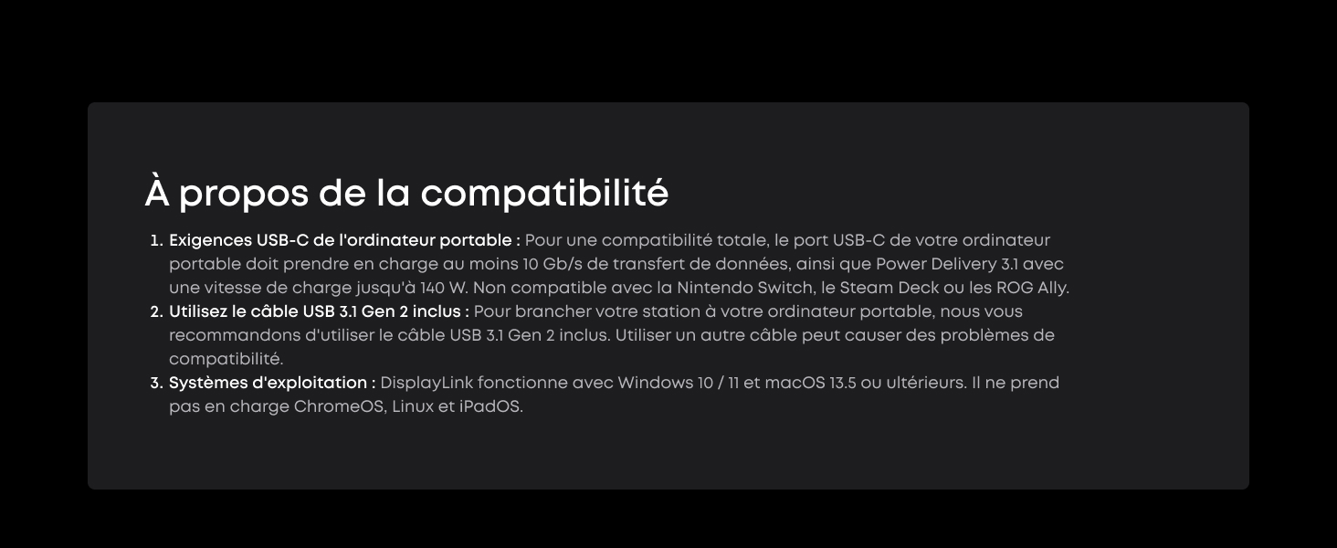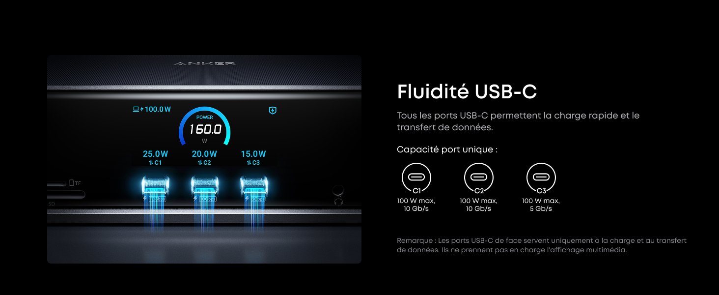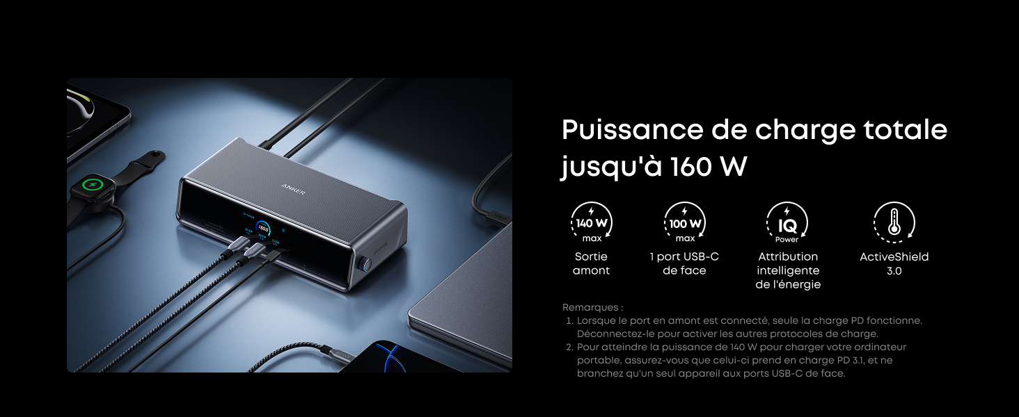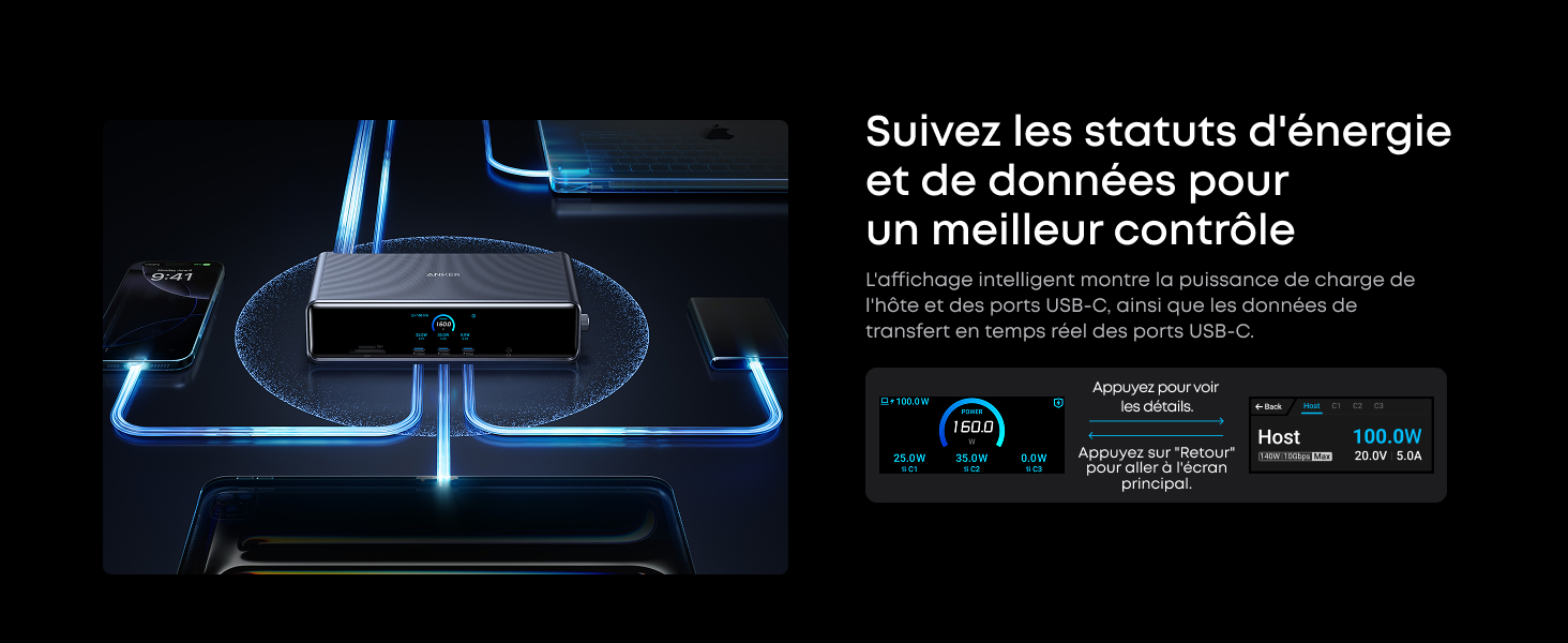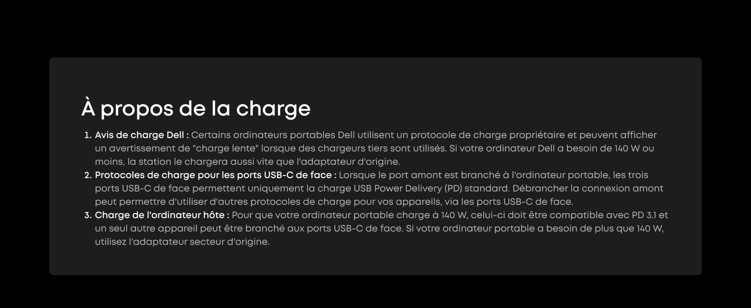 Puissance et performance à chaque port : Chaque port USB-C prend en charge à la fois la charge et le transfert de données. Votre ordinateur portable reçoit jusqu’à 140 W via le port amont 140 W, et chaque port USB-C de face fournit une vitesse de charge de 100 W. (Remarque : les ports USB-C de face ne prennent pas en charge l’affichage vidéo.)