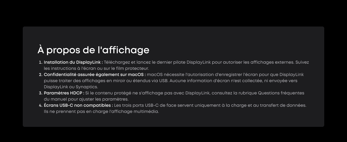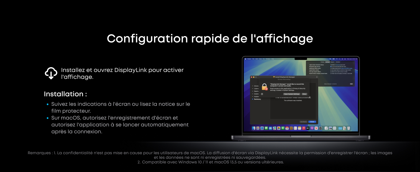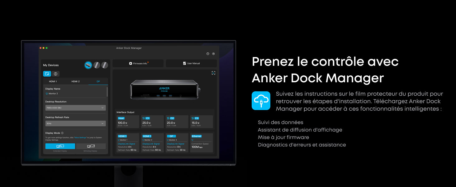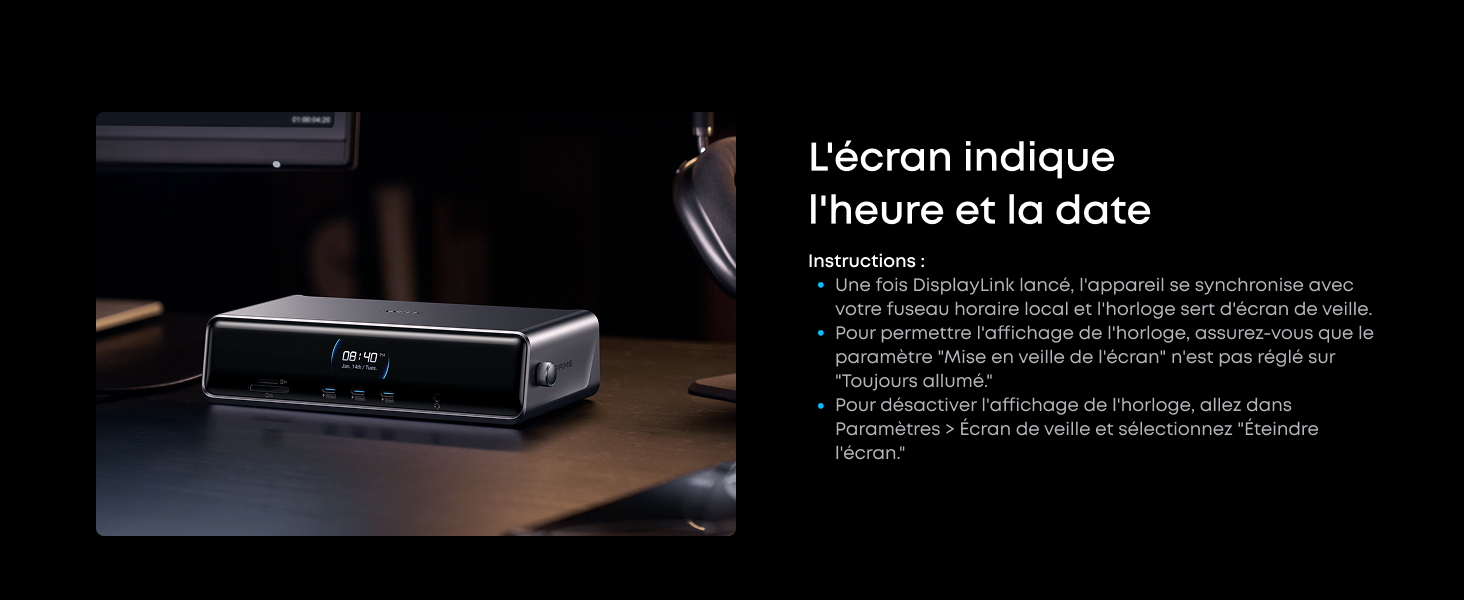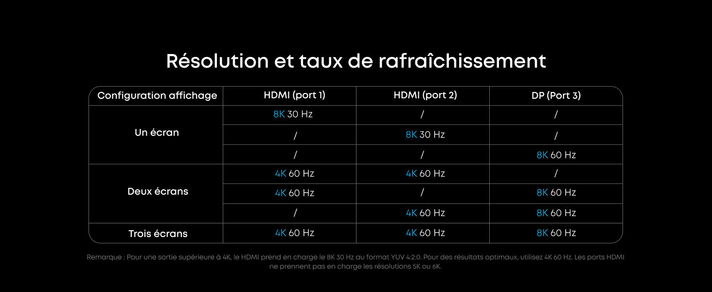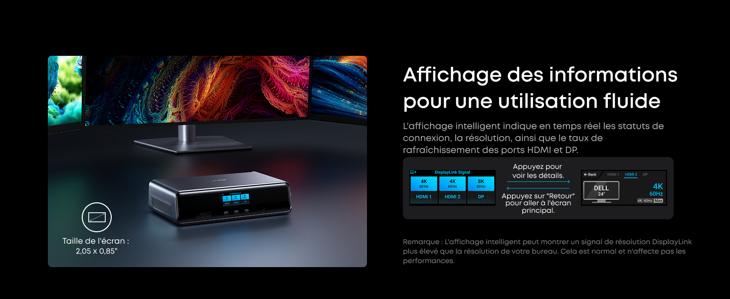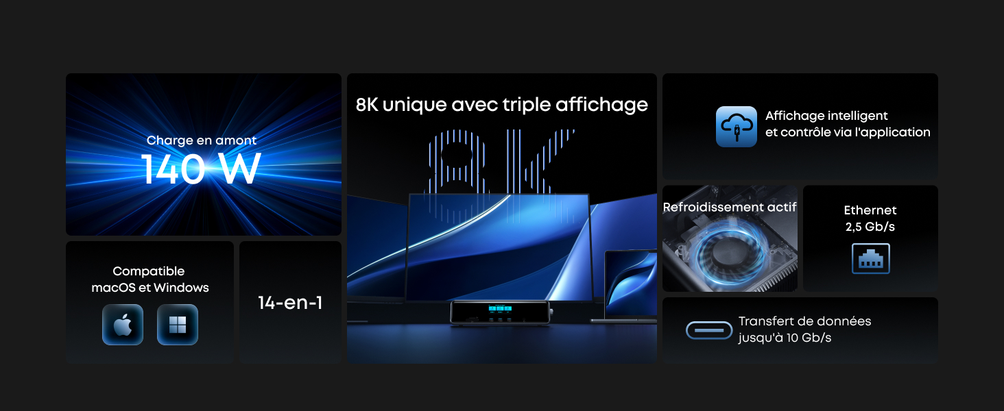 Sortie 8K, versatilité triple affichage : Alimentez jusqu’à trois écrans externes à la fois, notamment un moniteur 8K, pour gérer plusieurs tâches à la fois. Compatible avec les installations macOS et Windows. (Remarque : Affichage 8K uniquement sur moniteurs compatibles (pilote DisplayLink requis).