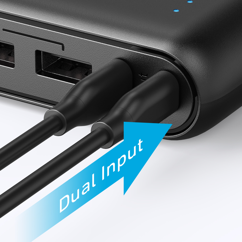 With dual input ports and a max input of 4A, a full charge takes just over 6 hours—twice as fast as a standard power bank. Recharge for a night; charge for an entire week.