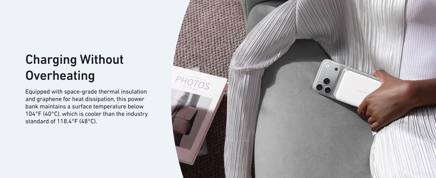 Anker's proprietary Wireless PowerIQ™ technology delivers higher efficiency through a high-conductive aluminum Qi2 module that ensures consistent 15W charging and superior heat management.