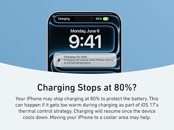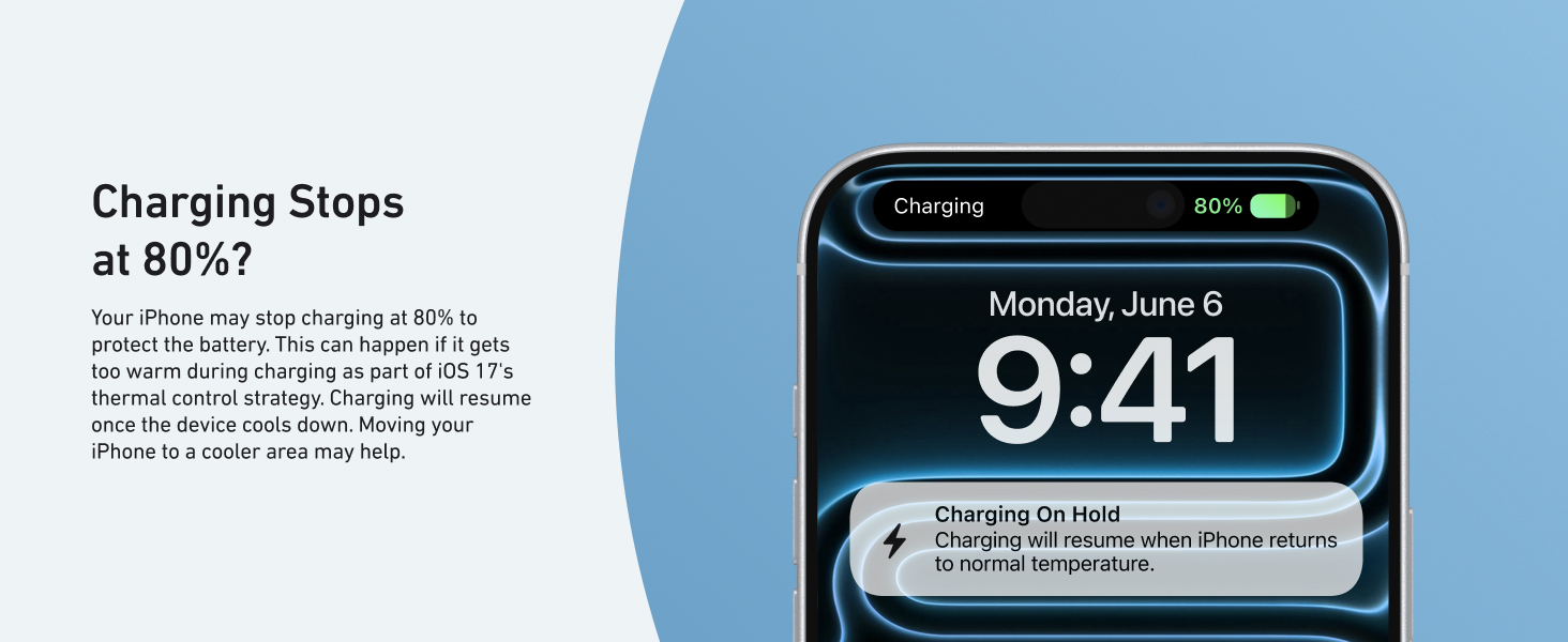Your iPhone may automatically stop charging at 80% to protect its battery from overheating, as part of iOS 17's thermal management strategy. Charging will resume once the device cools down. Moving it to a cooler spot can help speed up this process.