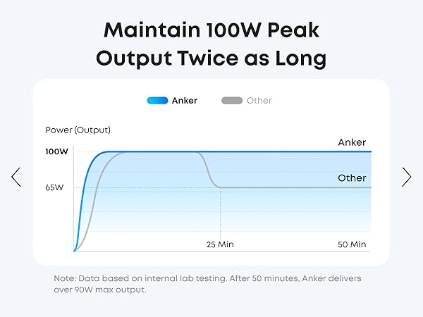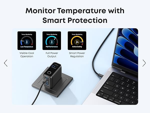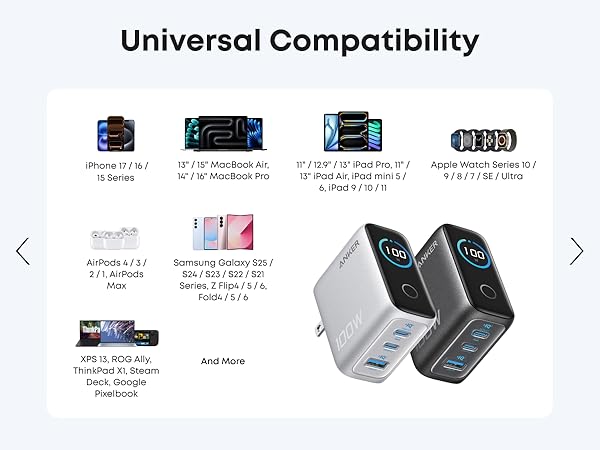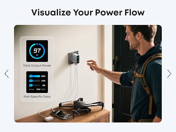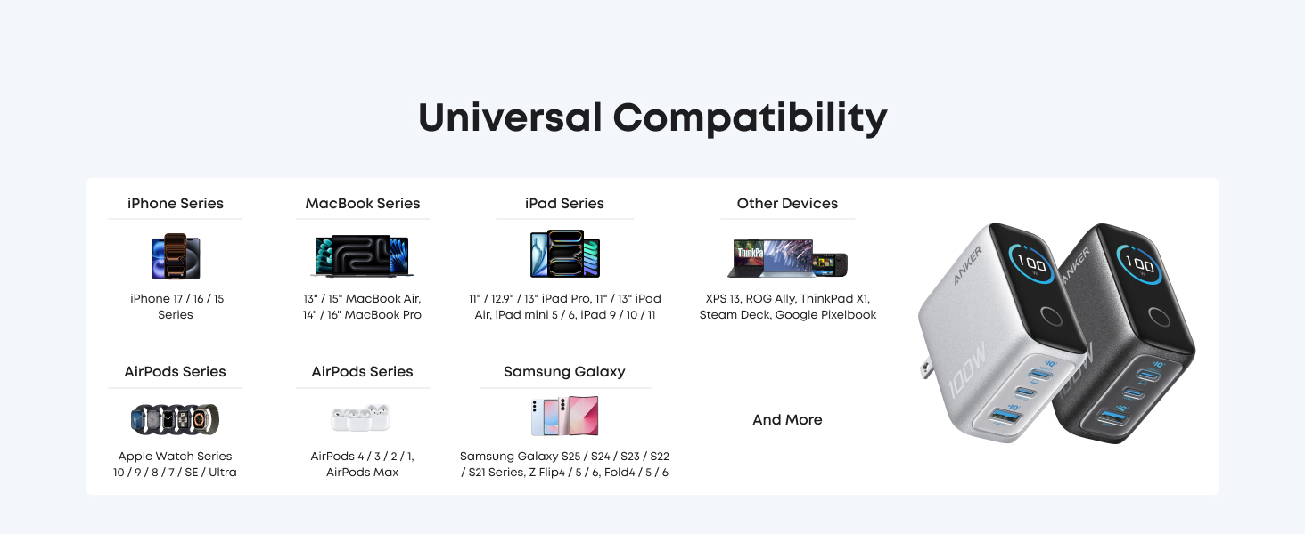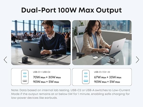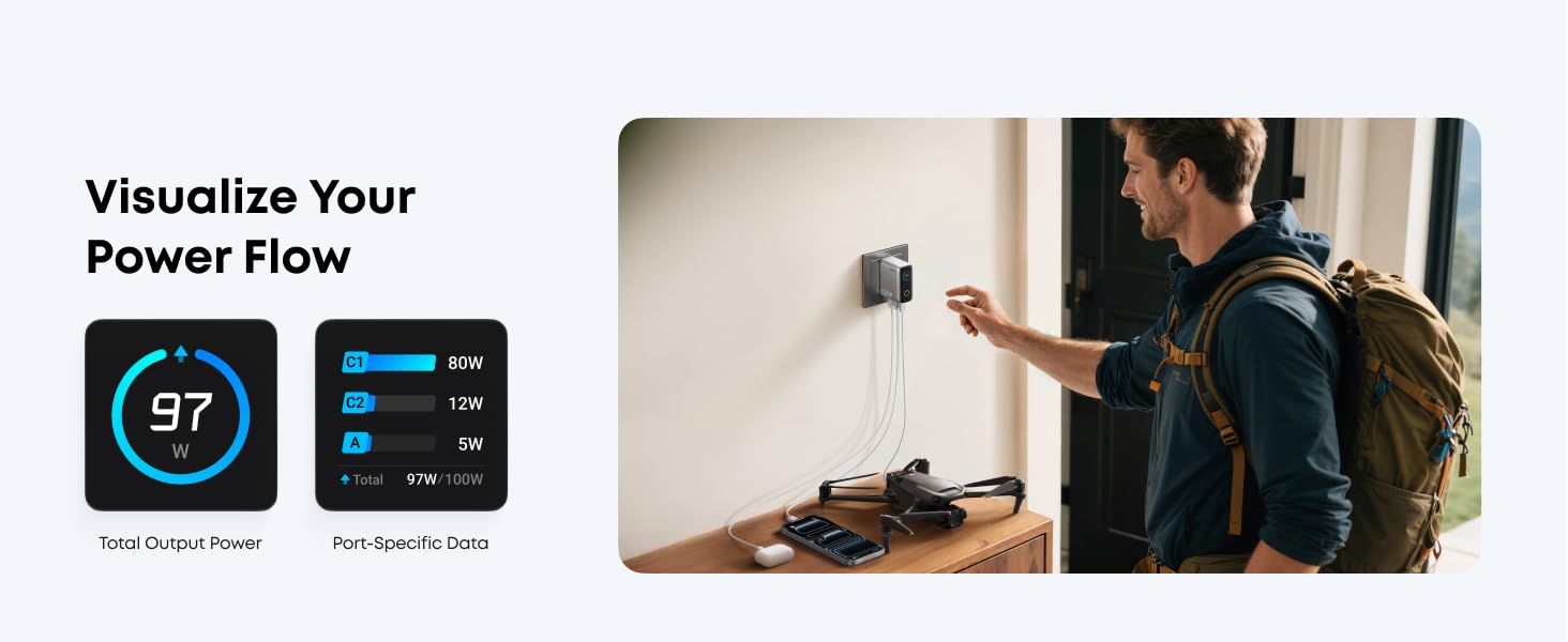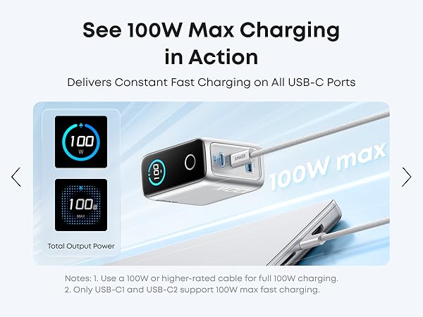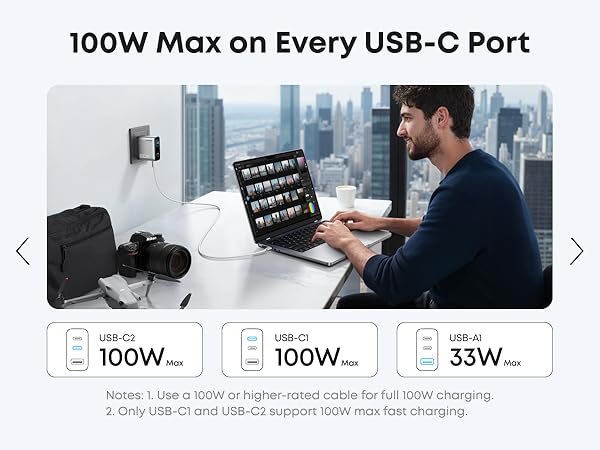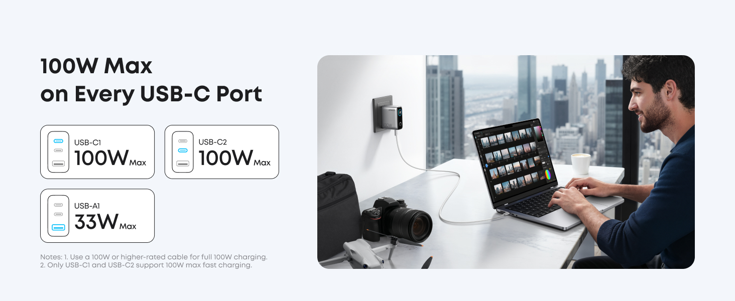 Advanced GaN technology delivers a steady 100W max output on every USB-C port in real time, providing ultra-fast charging for nonstop work, gaming, or video calls.