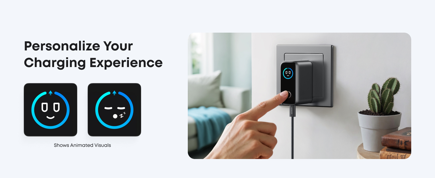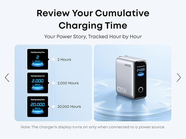 The dynamic smart display shows live readouts of power, voltage, and temperature with animated visuals. Milestone tracking records total usage hours, giving you a smarter, more engaging charging experience in real time.