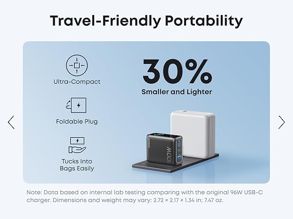 A foldable plug and a frame that's 30% smaller and lighter make it easy to pack. It saves space in your bag and lightens your load, replacing bulky bricks with effortless portability and powerful charging.