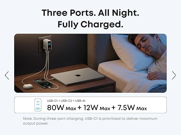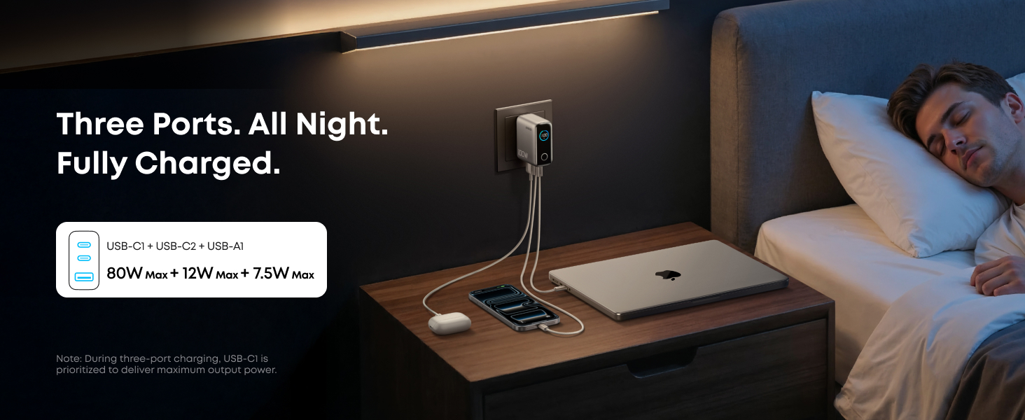 USB-C1 + USB-C2 + USB-A1: 80W + 12W + 7.5W