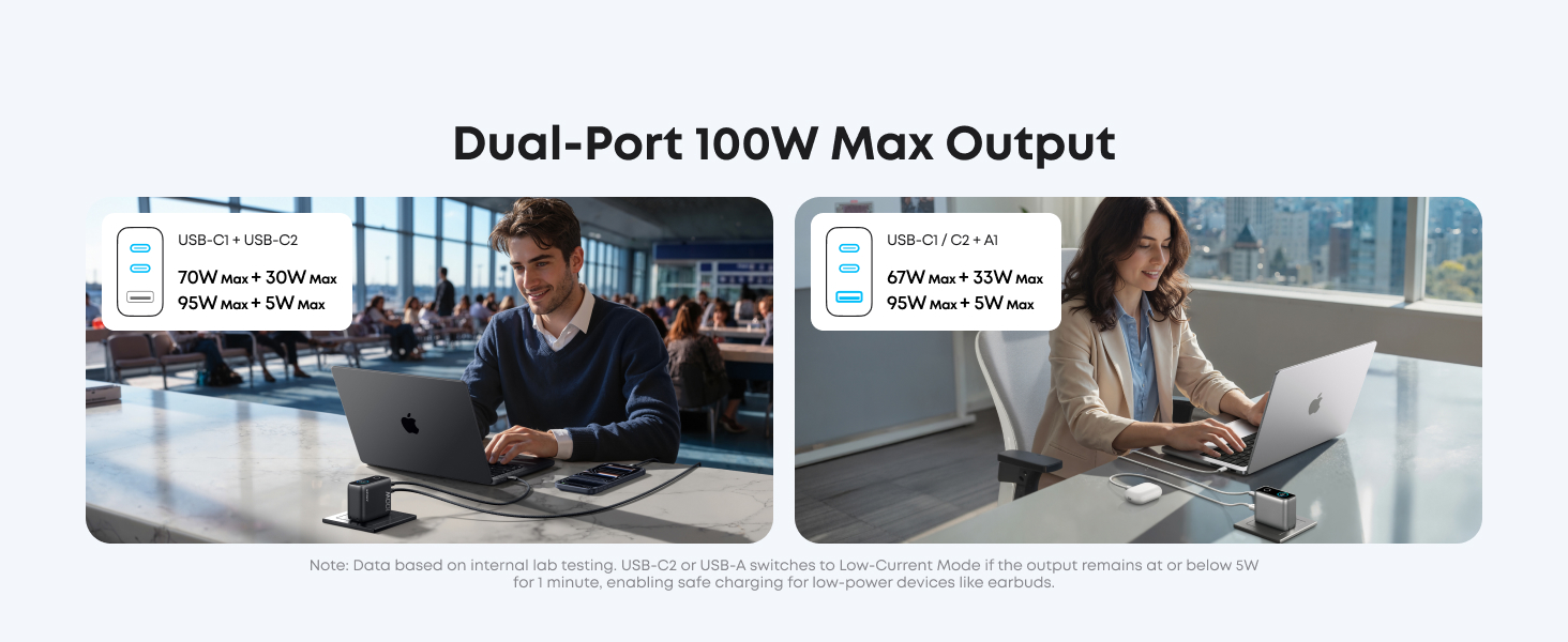 To activate 95W + 5W mode, the device connected to the USB-A port must meet low-current requirements—typically under 6V and 1A (e.g., headphones or smartwatches). If compatible, the charger will automatically switch to 95W + 5W mode after about 1 minute.