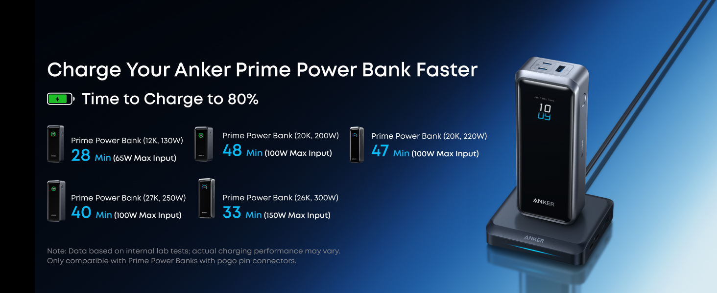 Charge ultra-fast with 150W max input to get a full charge on your 26,250mAh Prime Power Bank in just 47 minutes. (Note: Data based on internal lab tests; actual charging performance may vary.)