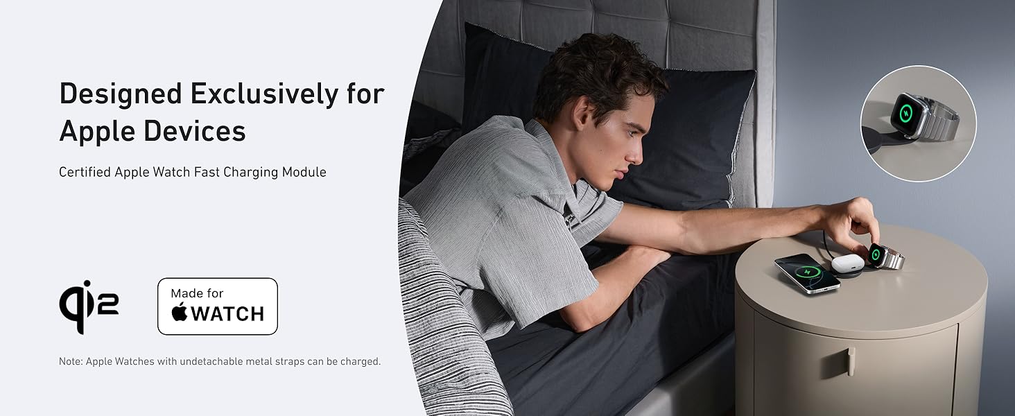 Offers robust safety features including temperature monitoring and protection against electrical anomalies, compatible with iPhones, AirPods, and Apple Watches.