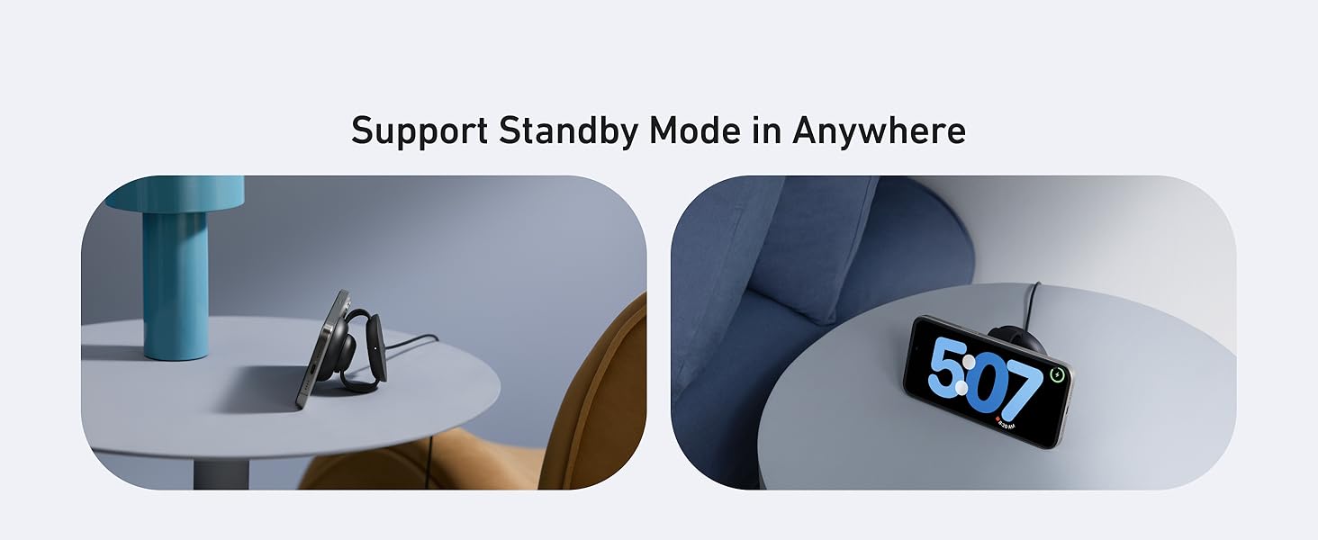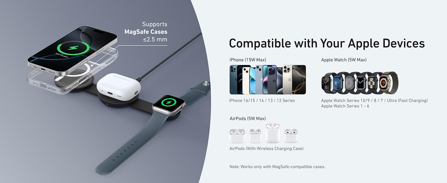 This wireless charger is designed exclusively for iPhones that support magnetic wireless charging, starting with iPhone 12 and later models. Cases over 2.5 mm thick or that are non-magnetic may reduce charging efficiency and are not recommended.