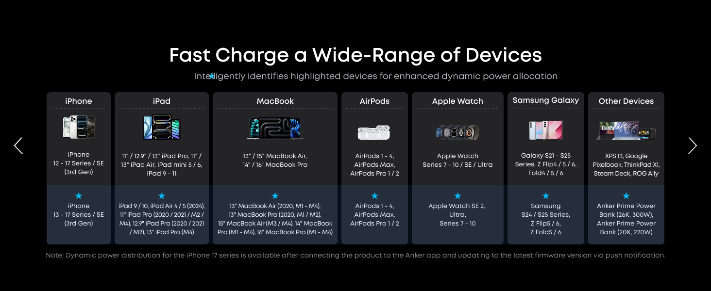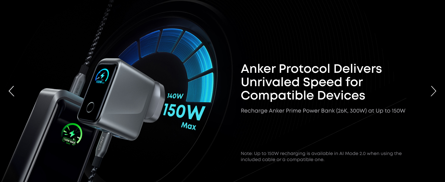 2. Up to 150W recharging for Anker Prime Power Bank (26K, 300W) is available under AI Mode 2.0 when using the included cable with the power bank or a compatible one. Data based on internal lab testing. Actual performance may vary depending on specific conditions of use.