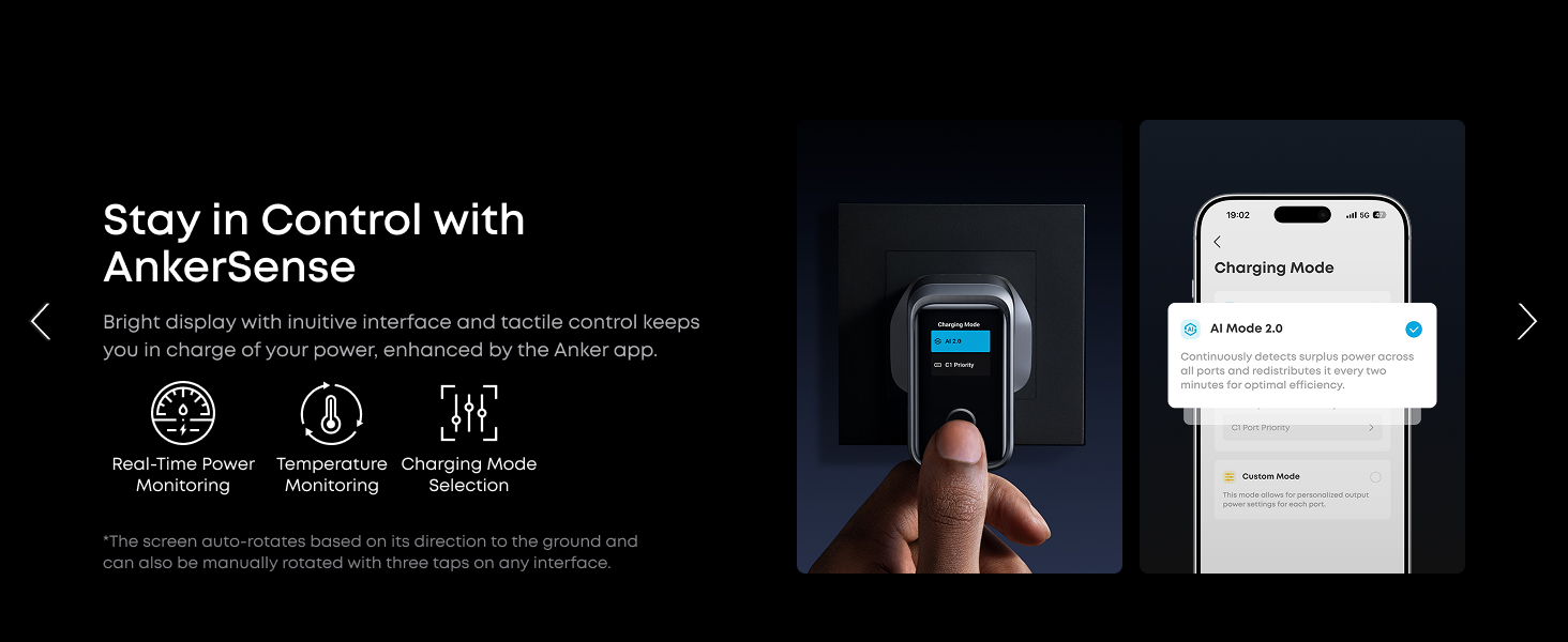 AnkerSense View shows real-time power distribution for each port. Select between AI Mode, Standard Mode, and Custom Mode directly on the screen, or unlock additional charging modes via Bluetooth in the app.
