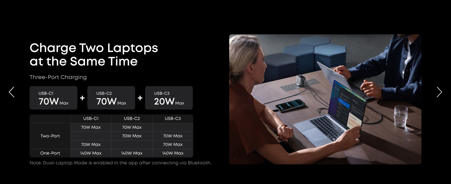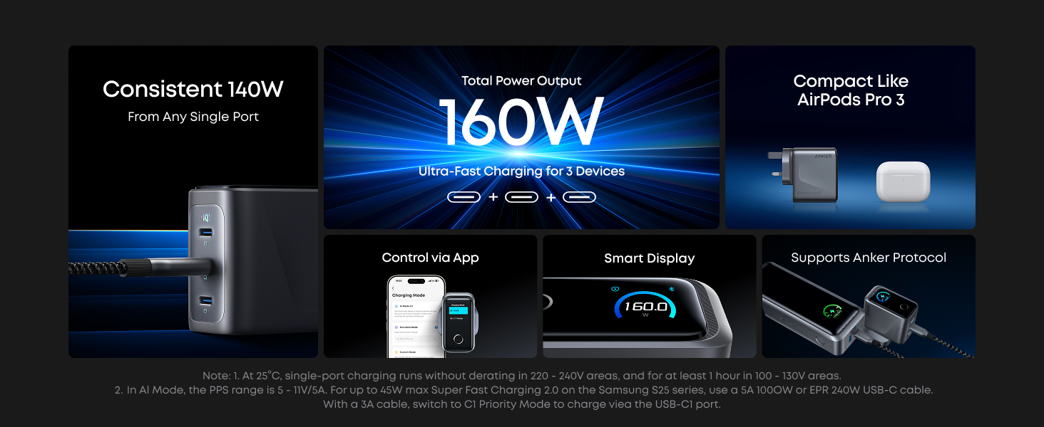 3. Based on internal lab testing in AI Mode 2.0, this charger powers a 16" MacBook Pro, iPhone 16 Pro Max, and 11" iPad Pro from 20% to 80% in the same time as using three original chargers (140W + 35W + 35W).