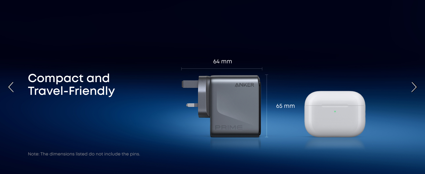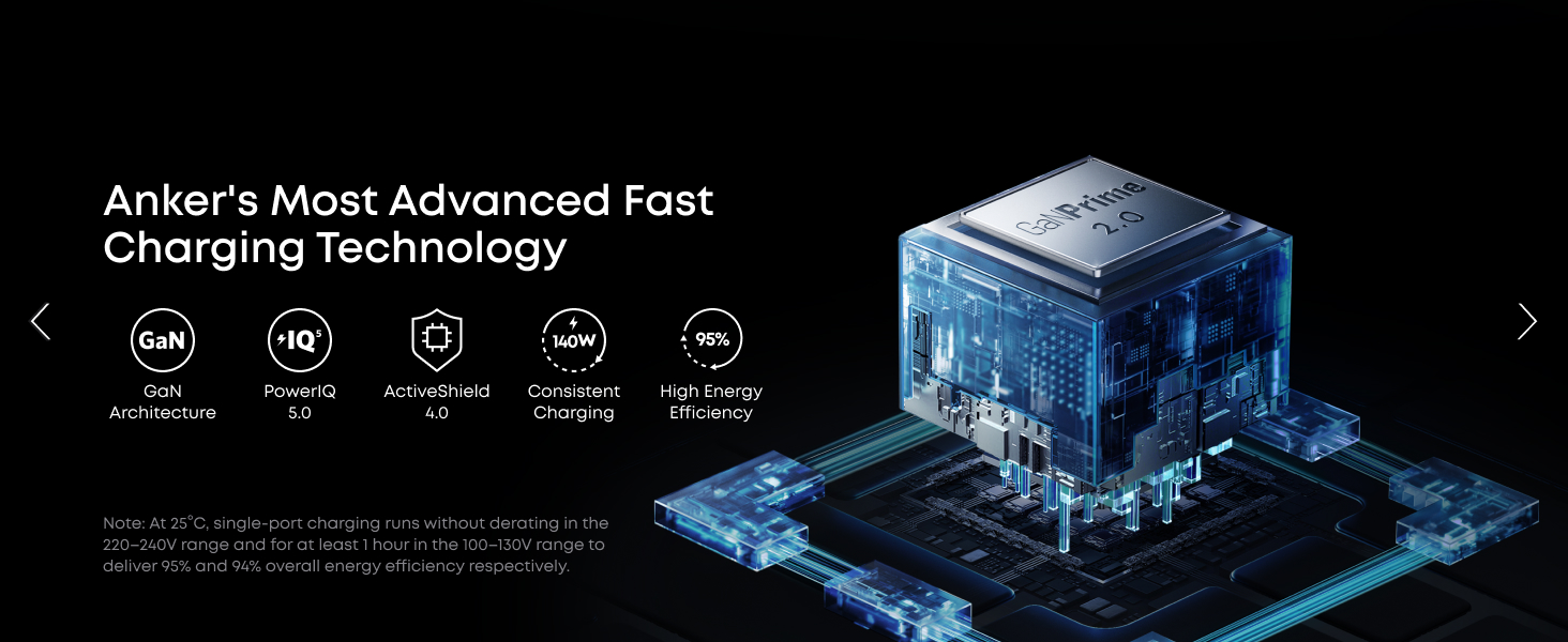 GaNPrime 2.0 Performance Powered by GaNPrime 2.0, Anker's most advanced fast charging technology combines PowerIQ 5.0 for smart allocation, consistent 140W single-port output, and ActiveShield 4.0 protection—all in a compact, pocket-ready design.