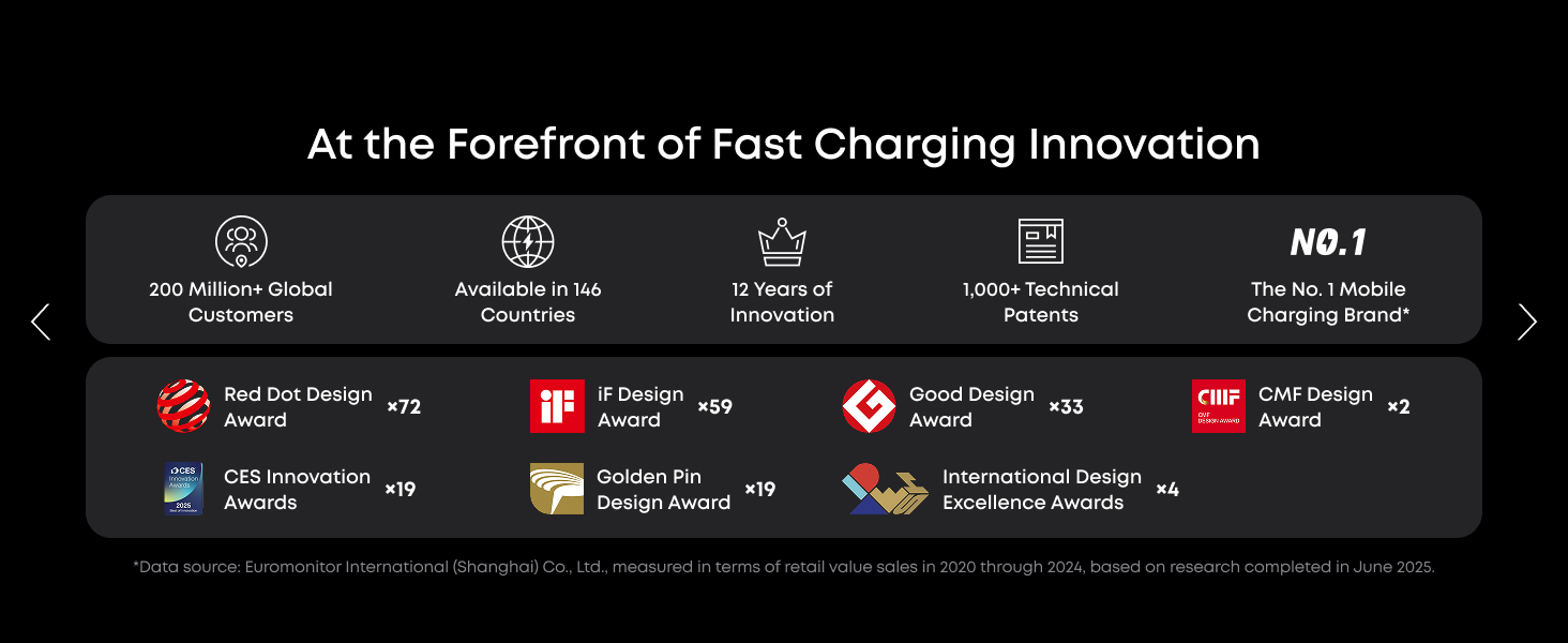 • Data source: Euromonitor International (Shanghai) Co., Ltd., measured in terms of retail value sales in 2020, 2021, and 2022, based on research conducted in October 2023. Mobile charging brands are defined as brands if more than 75% of their retail sales are contributed by mobile phone charging products. Mobile phone charging products include chargers, wireless chargers, power banks, and charging cables, and these accessories can also be used for other consumer electronics devices.