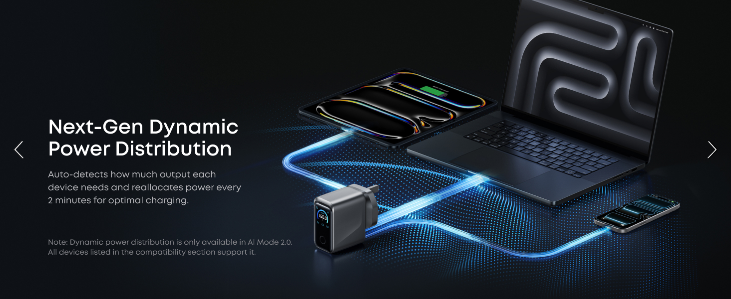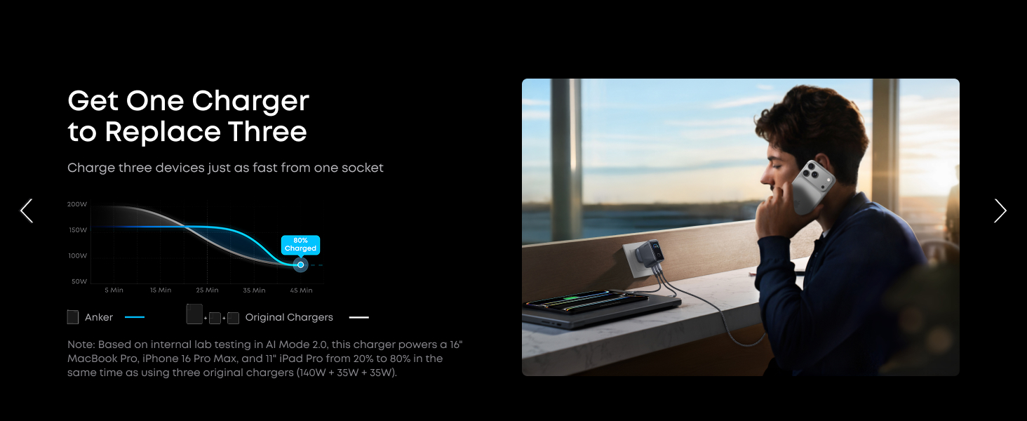 3. Based on internal lab testing in AI Mode 2.0, this charger powers a 16" MacBook Pro, iPhone 16 Pro Max, and 11" iPad Pro from 20% to 80% in the same time as using three original chargers (140W + 35W + 35W).