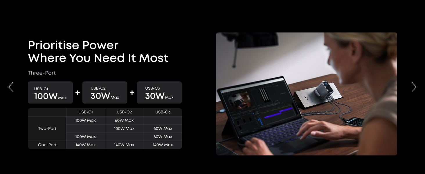 USB-C1 / C2 / C3: 5V⎓3A / 9V⎓3A / 15V⎓3A / 20V⎓5A / 28V⎓5A / 28V⎓5.36A(150W Max)