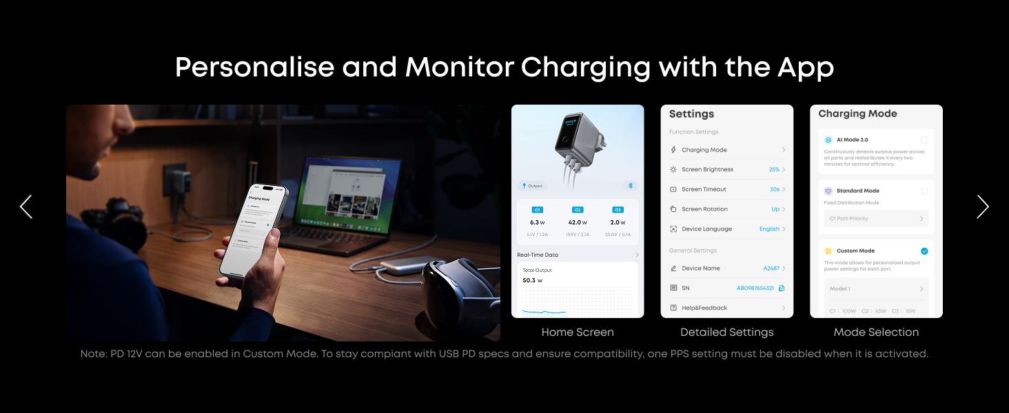 AnkerSense View shows real-time power distribution for each port. Select between AI Mode, Standard Mode, and Custom Mode directly on the screen, or unlock additional charging modes via Bluetooth in the app.