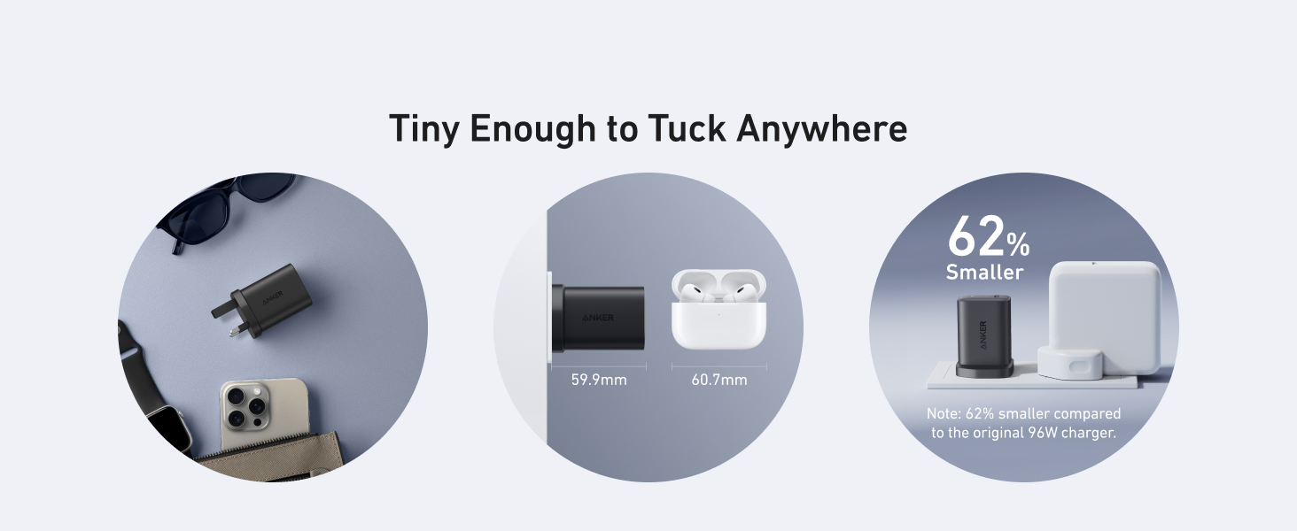 62% smaller than the original 96W MacBook charger, featuring a foldable plug for easy portability—perfect for travel.